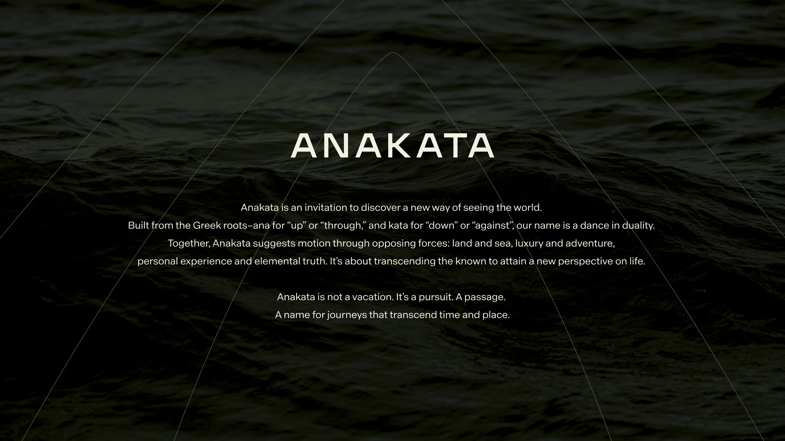 From brand naming through messaging, we positioned Anakata around deep discovery. Not a floating resort with excursions, but a guided method of immersion where intimacy, expertise, and adaptive days become gateways to revelation. The narrative reframes purchase from ship specs to outcomes guests actually feel: access, awe, and communion. We focused on making luxury implicit and experience explicit.
