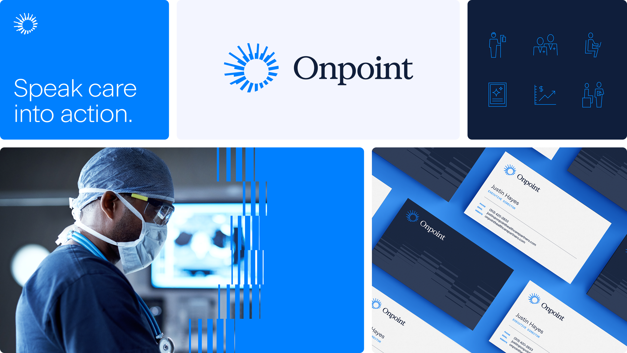 We transformed Onpoint’s visual identity to match its repositioning as a category leader in Agentic AI. The new design system deploys a trust blue palette paired with futuristic gradients, modular flow graphics, and dynamic iconography that balances credibility with modernity. Every element signals execution, intelligence, and safety-first precision. The Flow solutions (ChartFlow, CodeFlow, CareFlow, NetworkFlow) are now expressed through a cohesive visual architecture, shifting perception from a fragmented vendor to a cutting-edge AI brand built for healthcare systems.