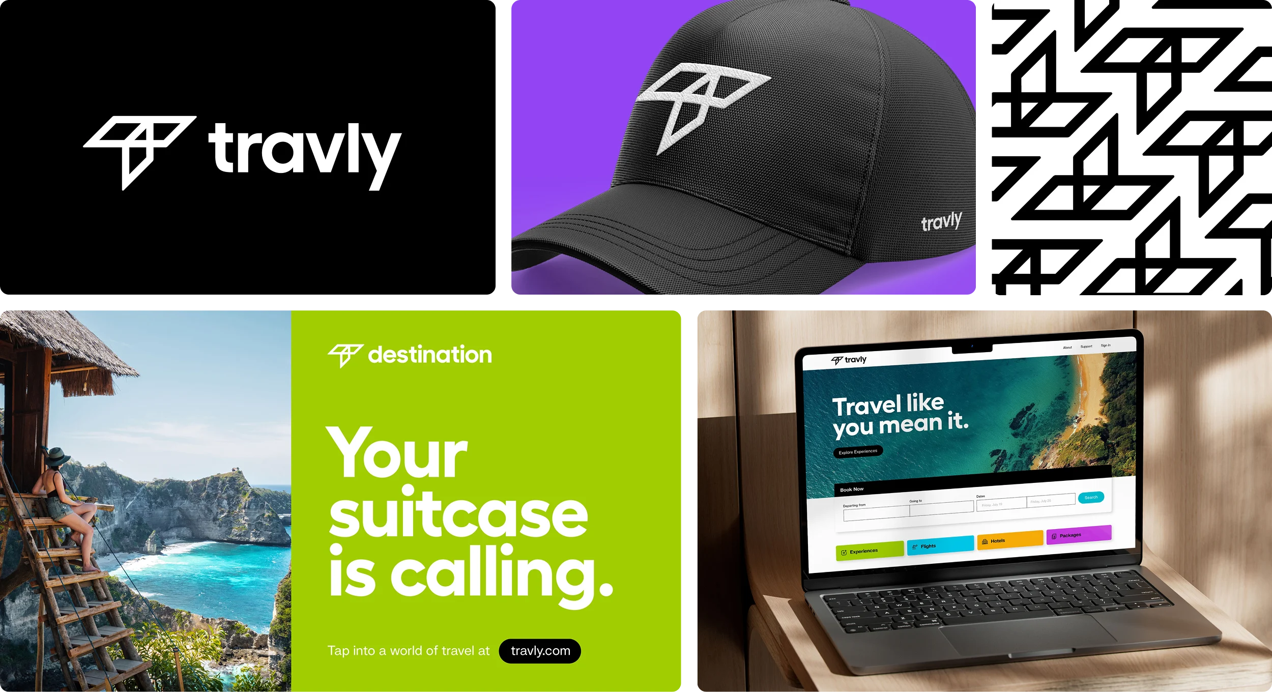 At the heart of Travly’s new visual identity is a paper airplane motif. The precise angles and geometric shapes convey a sense of upward trajectory and movement. A bright and tropical color palette adds a playful dimension, reinforcing a feeling of energy and enthusiasm. To complement these visual elements, we employed the bold and confident headline typeface, Fellix, paired with the highly legible sans-serif typeface, Swizzy, for supporting text. This combination of imagery, color, and typography embodies the brand’s adventurous spirit.