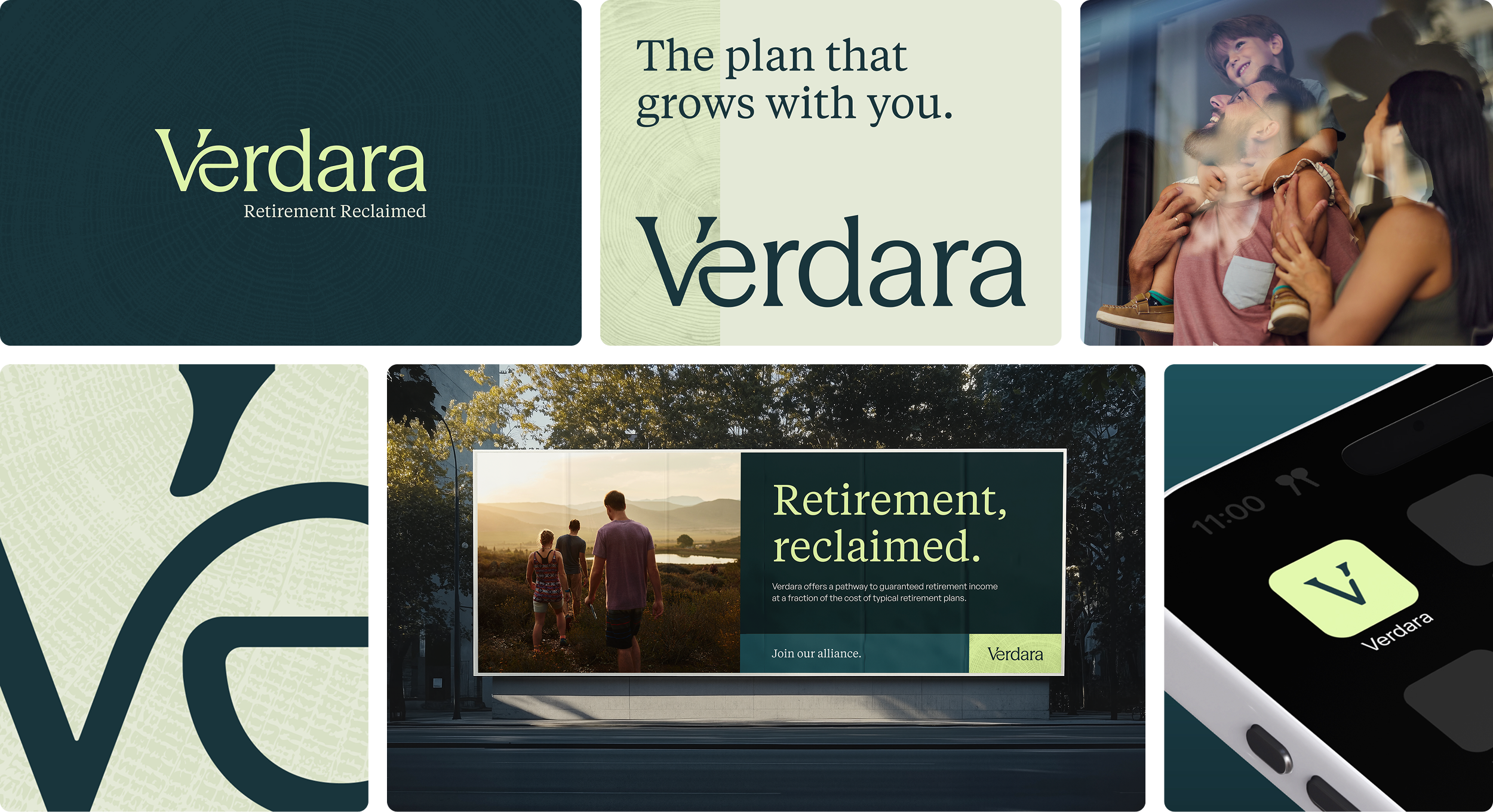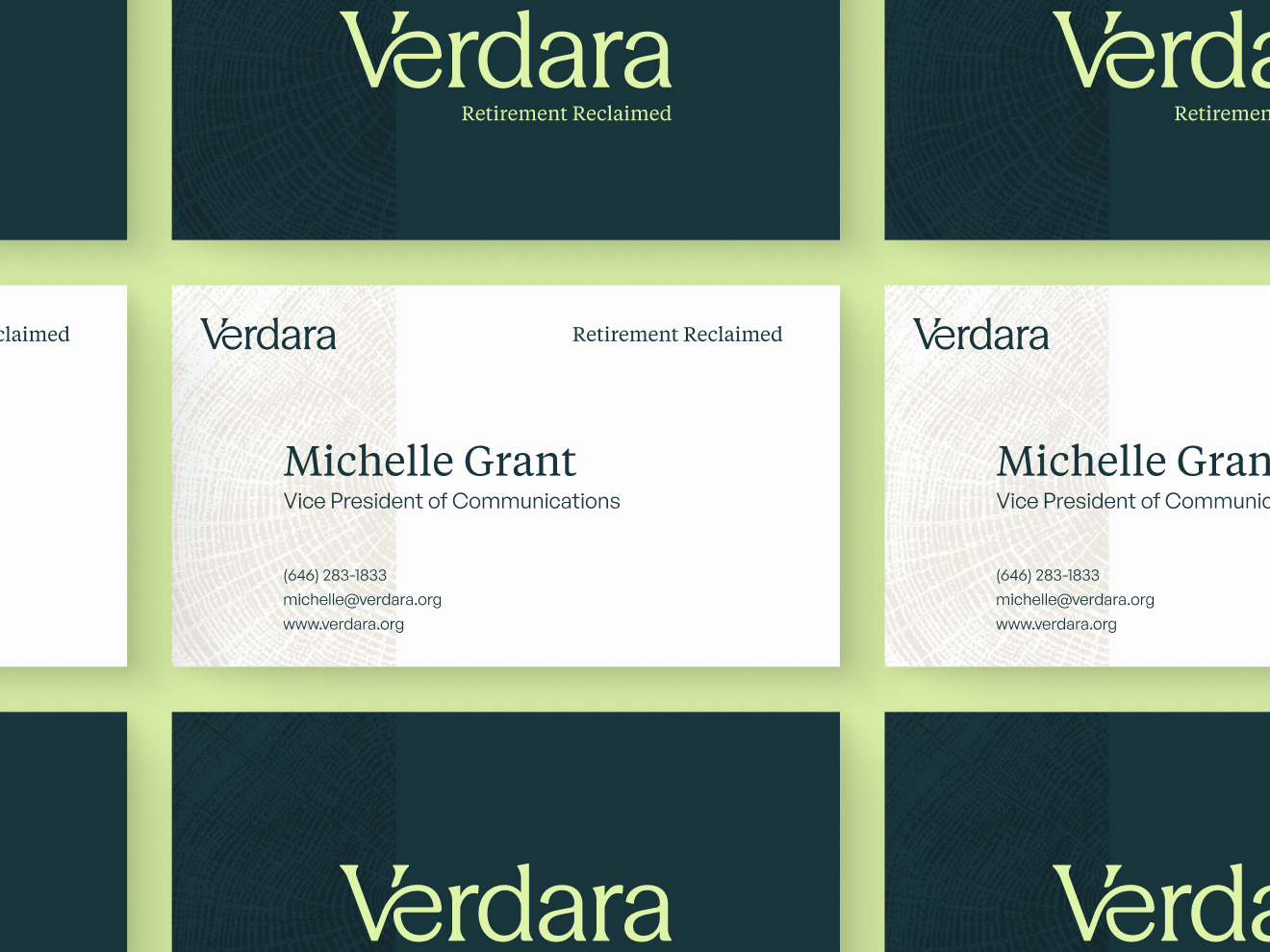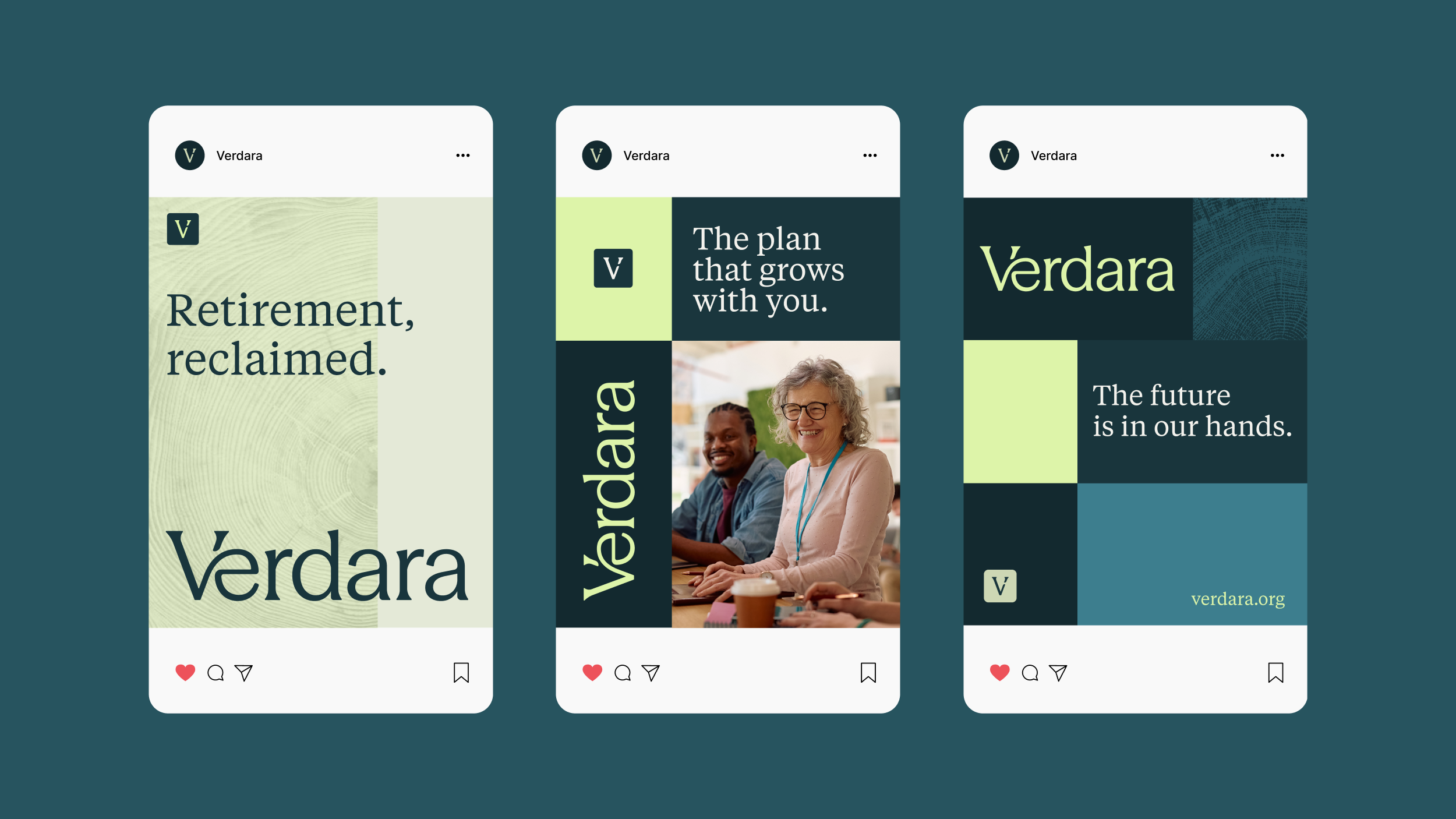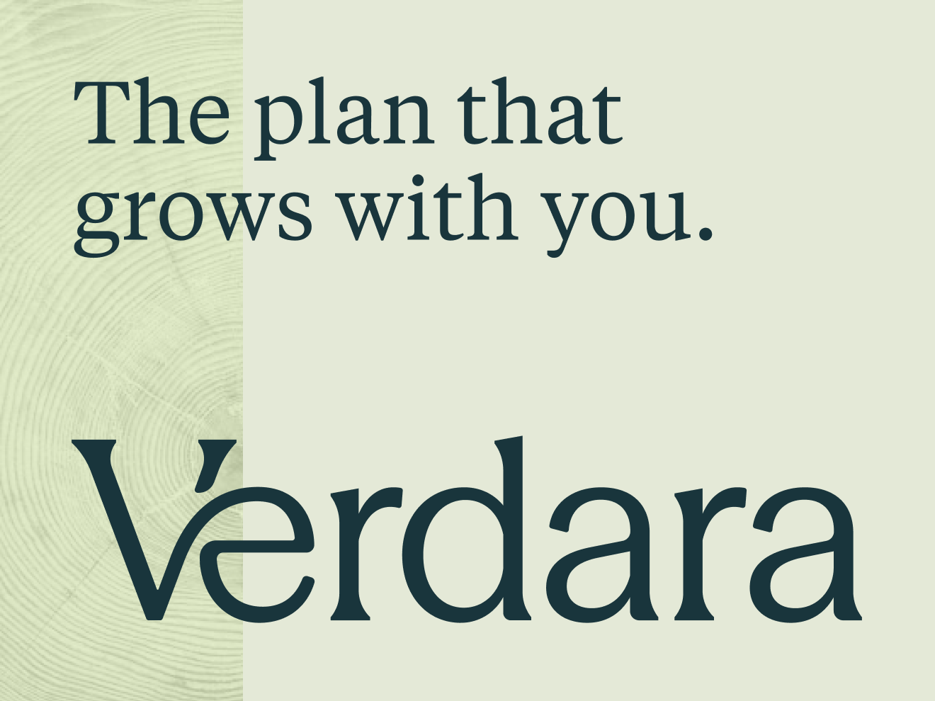 That brand strategy carried through the narrative, visual identity, and messaging. Verdara’s identity balances institutional trust with human warmth, pairing a stable, credible foundation with lime green accents to signal future-forward thinking. Tree rings were introduced as a recurring design device, reinforcing the idea of natural growth over time and progress that compounds. Language was stripped of jargon, avoiding urgency and establishing trust with clear and approachable value propositions.